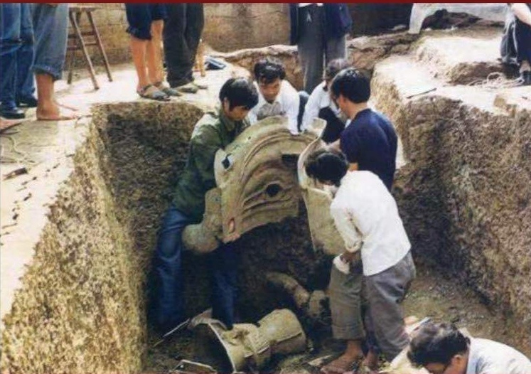 从照片上可以看到,几位工作人员在一个露天的长方形的挖掘坑里奋力抬出一个有所折叠的大型器物,如今它有了正式名字:青铜纵目面具;此外,工作人员脚下还散落不少其他不规则的发掘物。虽然发掘条件很简陋,但工作人员为了减少对文物的破坏,没有穿鞋或者仅穿非常轻薄的单鞋。据当时参与了发掘的金沙遗址博物馆馆长朱章义回忆,后来发掘人员干脆趴在坑底进行清理和提取。