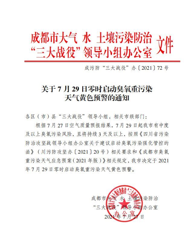 7月27日,成都市大气、水、土壤污染防治“三大战役”领导小组办公室发布通知,根据7月27日空气质量预报结果,7月29日起成都市有中度及以上臭氧污染风险,且将持续3天及以上,按照《四川省污染防治攻坚战领导小组办公室关于建议启动臭氧污染强化管控的函》(川污防攻坚办〔2021〕20号)相关要求和《成都市臭氧重污染天气应急预案(2021年版)》相关规定,成都市决定于2021年7月29日零时启动臭氧重污染天气黄色预警。