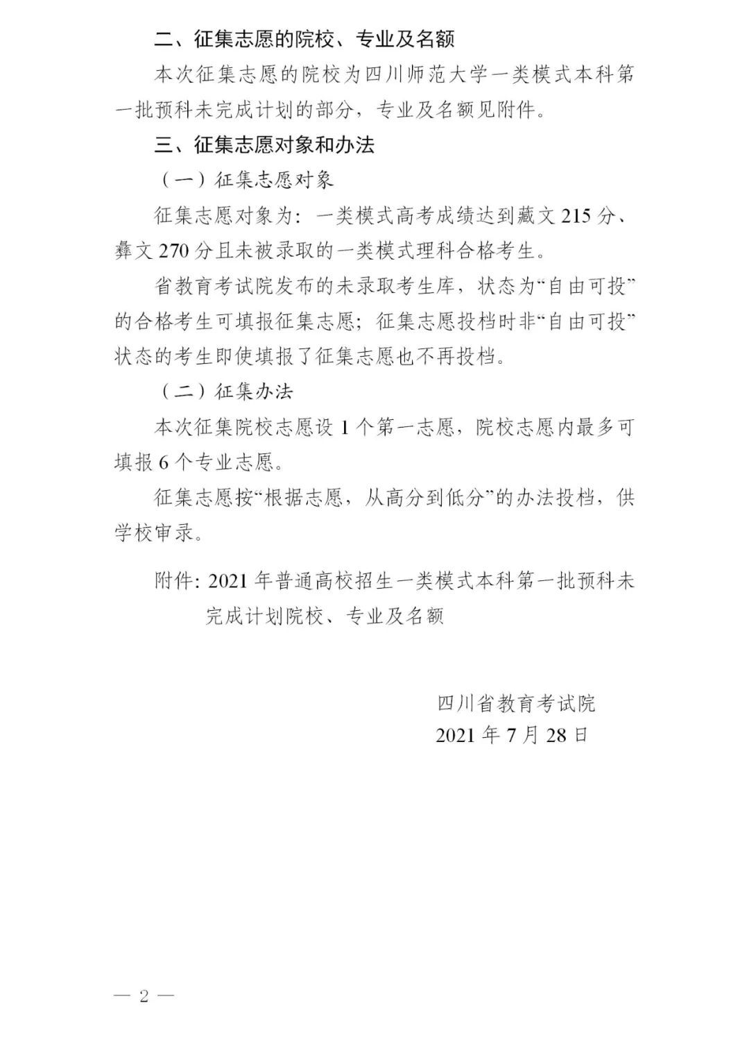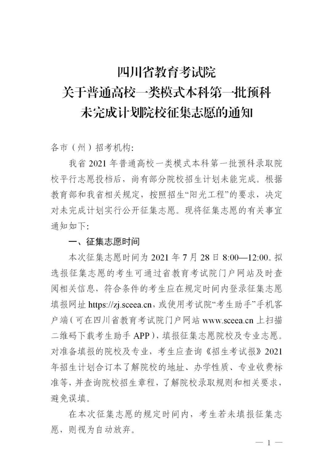 7月28日,川观新闻从省教育考试院获悉,四川从今日8:00起启动普通高校一类模式本科第一批预科未完成计划院校征集志愿来啦,志愿征集截止时间为7月28日12:00。征集志愿有关事宜具体如下: