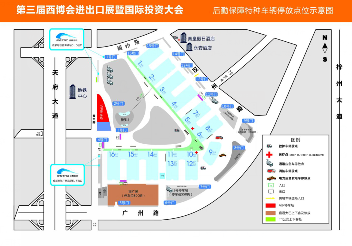 9月20日—23日,全面启用西博城P3、P4、P5、东南广场、地下A、B、D区停车场,供所有观展会社会车辆停放使用。由天府大道、宁波路、梓州大道、杭州路、通州路、广州路前往车辆按路面指引导示标志直达停车场区域。