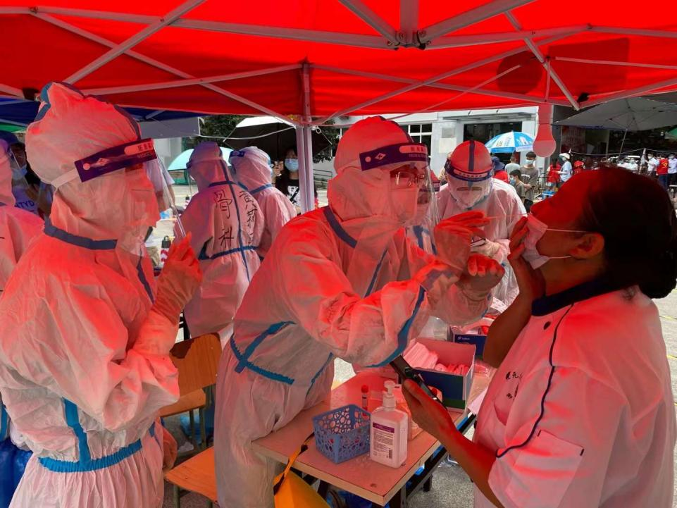 炎热的天气,配上密不透风的防护服,医务工作者平均10秒不到就要完成一次采样的背后,是白衣天使们的辛苦付出。防护服内,衣服已被汗水浸湿,手套里,双手已被汗水泡白,但为了人民的健康,依然马不停蹄、义无反顾奋战在抗疫一线。