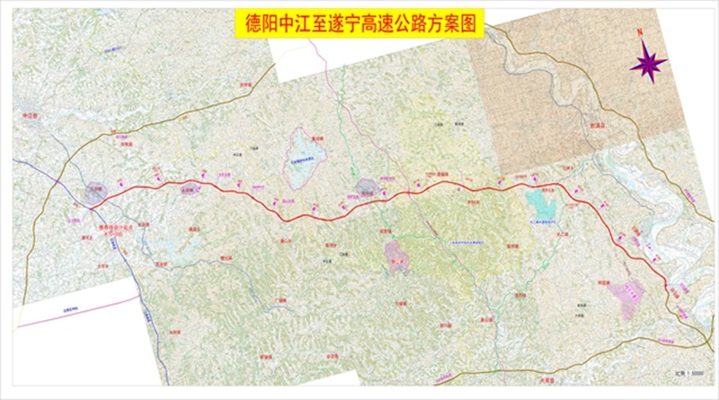 ——德阳中江至遂宁高速公路(84公里,总投资90亿元)。项目是《四川省高速公路网规划(2014—2030年)》中德阳至遂宁两市间的便捷联系通道,也是成德绵城市群通往川东、联系重庆的便捷通道。项目路线起于德阳市中江县玉兴镇,与在建成都三绕相接,经绵阳市三台县、遂宁市射洪市、大英县,接遂回高速公路,路线全长84公里。项目建设对于完善成渝经济圈公路网骨架,促进区域一体化加快发展等具有重要意义。