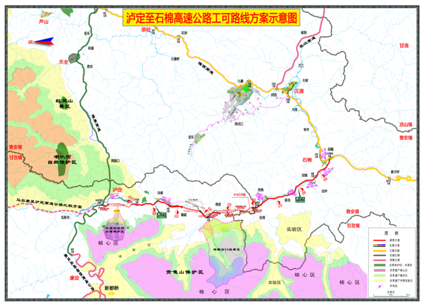 ——泸定至石棉高速公路(97公里,总投资161亿元)。项目是《四川省高速公路网规划(2014—2030年)》中连接G5雅西高速公路和G4218雅康高速公路的重要联络线,也是通往甘孜藏区和少数民族聚居地区脱贫致富的重要扶贫通道。路线起于泸定县伞岗坪,接雅康高速公路,经泸定南、海螺沟景区东、安顺,止于石棉县,接雅西高速公路,路线全长97公里。项目建设对于完善我省高速公路网,优化区域公路骨架网,增加进出甘孜州快速通道,改善区域交通条件,促进甘孜藏区和少数民族聚居地区脱贫致富,带动区域经济加快发展等具有重要意义。