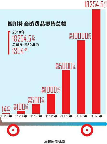 省统计局近日发布报告显示,2018年,四川实现社会消费品零售总额18254.5亿元,总量是1952年的1304倍,创下年均11.5%高速增长的奇迹。