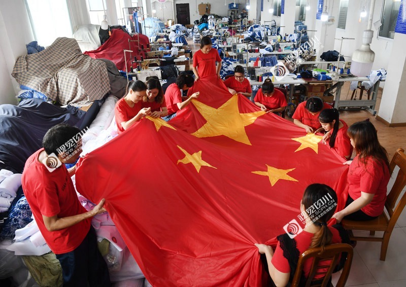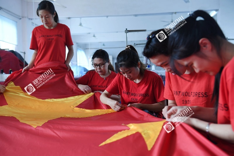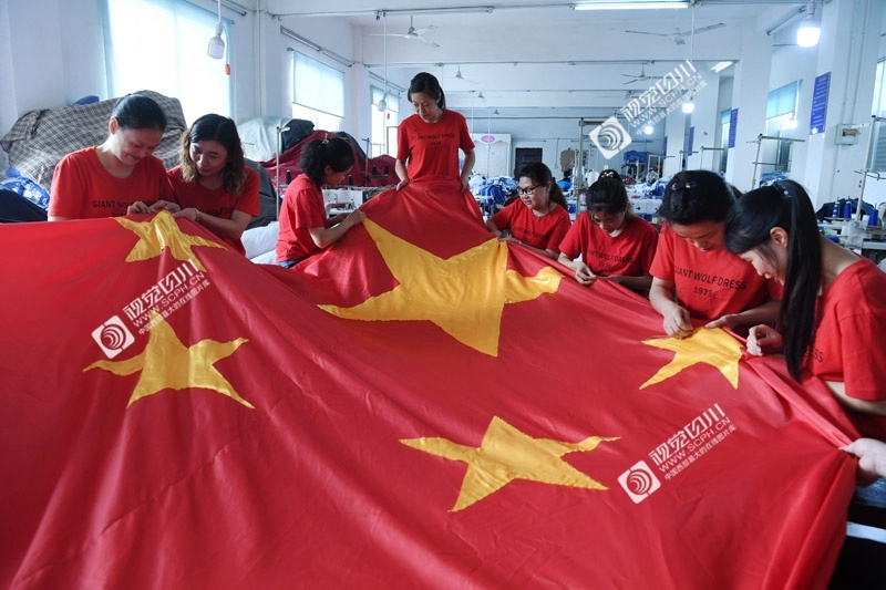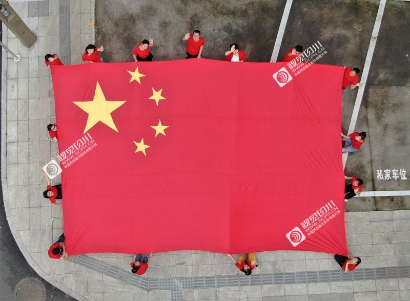 9月16日,位于德阳市旌阳区孝感镇的德阳巨狼服饰有限公司内,10多名工人高擎手工缝制的一面7.5米×5米的国旗,并齐声高唱《我和我的祖国》,表达对祖国的无限热爱和深情祝福。