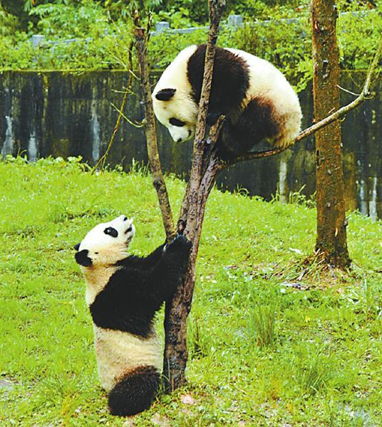 碧峰峡基地内嬉戏的大熊猫。记者王飞摄