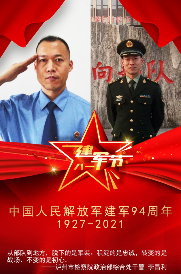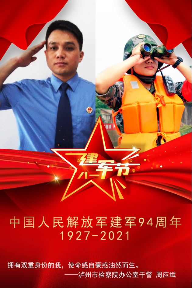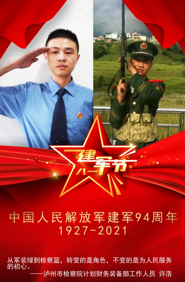 泸州市人民检察院计划财务装备部工作人员许浩,2010年10月至2012年12月,许浩在武警云南总队某支队服役,2017年8月进入泸州市人民检察院计划财务保障部工作人员,从军装绿到“检察蓝”,退伍不褪色,转变的是角色,但不变的是为人民服务的初心。许浩表示,他为自己曾经是一名军人而自豪,请祖国和人民放心,若有战、召必回!