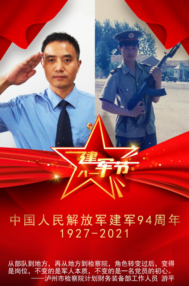 泸州市人民检察院计划财务装备部工作人员游平于1992年入伍,曾在原济南军区某集团军服役3年,服务保障于团级机关,1995年加入中国共产党成为一名共产党员,同年复原回到地方。2006年,进入泸州市人民检察院,从部队到地方,再从地方到检察院,对游平来说变得是岗位,不变的是军人本质和一名党员的初心。