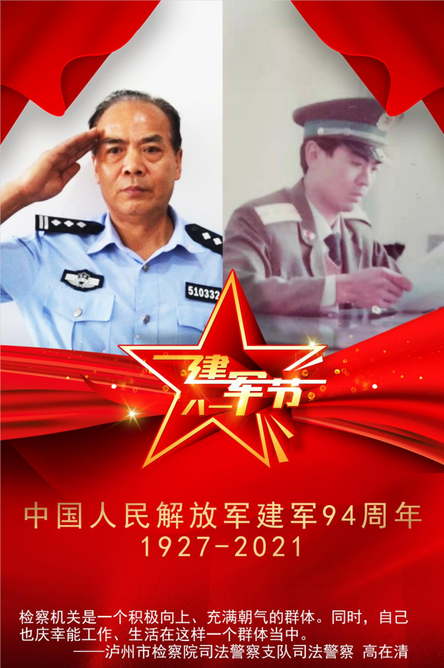 泸州市人民检察院司法警察支队司法警察高在清1981年底10月入伍,服役于原兰州军区空军某部,在部队服役了近18年。1998年9月,高在清转业被分配到泸州市人民检察院工作,今年已经58岁的他,可以说是一名“元老”了。“到检察院工作后给我最大的感受就是,泸州检察机关是一个积极向上、充满朝气的团队,始终保有持拼搏创一流的干劲,大家团结友爱,工作中相互支持,相互理解相互包容,有幸工作、生活在这样一个大家庭中,我感到很欣慰。”