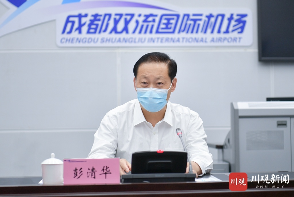 彭清华来到双流机场停机坪卫星厅,仔细询问各项防控措施落实情况,在机场运行指挥中心看望慰问工作人员,通过视频察看了解针对境外和国内中高风险地区乘客落实专门通道、开展流调、核酸采样、转运等工作,了解机场边检、海关、地勤等工作人员防护措施落实情况。