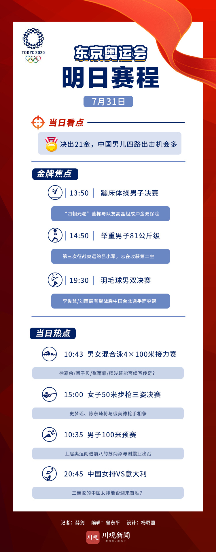 明天是7月的最后一天,东京奥运会进入第八个比赛日。全天将进行田径、游泳、举重、体重、足球等27个大项的比赛,决出21枚金牌。中国代表团在游泳、蹦床、射击、举重等项目中有一定实力冲金。
