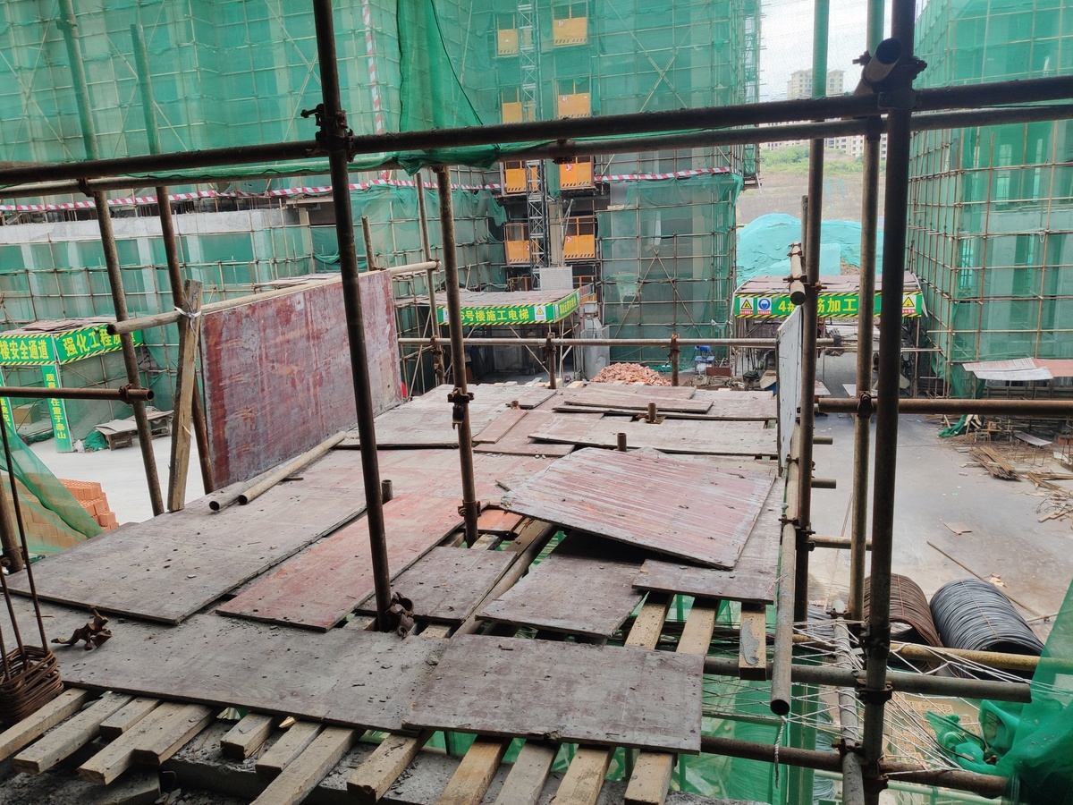 施工现场安全管理方面:楼层临边、洞口防护严重缺失,电梯井口防护栏杆被拆除或移除;施工便梯搭设不规范,与支模架相连,立杆悬空,搭设斜率过大,整体稳定性差;卸料平台(落地)搭设与外架支模架相连接,未进行围挡,未满铺脚手板;悬挑脚手架首层未封闭;落地脚手架连墙件设置不足,与方案不符;作业层外架高度不足,大横杆搭接错误;消防设施未上楼层,现场有部分灭火器失效;钢筋加工机械未有效接地;主汛期未进行漏电电阻测试检查,临时施工用电方案编制人员不符合要求,脚手架未按方案设置防雷接地装置;现场工人不戴安全帽。