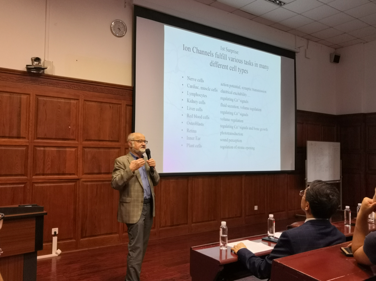 厄温·内尔教授曾于1963年至1966年在德国慕尼黑工业大学学习物理学,后赴美国威斯康辛大学攻读生物物理学硕士。1991年,内尔教授因发现了活细胞内离子通道获得诺贝尔生理学或医学奖。本次讲座即介绍了这一发现基本情况,以带给在座的“未来科学家和医学工作者”一些启发。