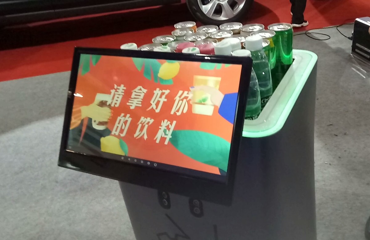 除却上述应用在酒店等小场景的机器人,展馆里还展示了一种造型类似,但是应用于汽车4S中心、政务大厅等大场景的机器人。只要在手机配套的小程序上下单饮料或者食品,服务员备餐完成后,机器人就能自动到达吧台取走餐品,送达用户手中。没有运送任务时,它就会自己到充电桩充电。