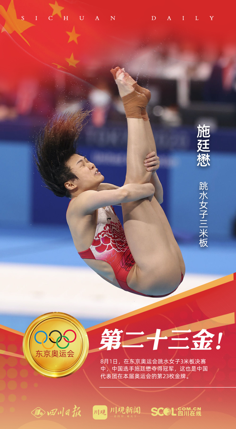 8月1日下午,在东京奥运会跳水女子3米板决赛中,中国选手施廷懋夺得冠军,这也是中国体育代表团在本届奥运会的第23枚金牌。