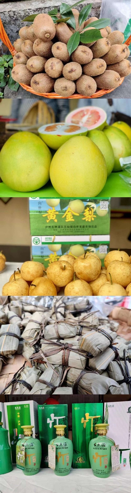 猕猴桃、柚子、黄金梨、黄粑、竹叶酒…来自泸州各区县的农民各自展出自己的丰收成果来表达丰收的喜悦。胡容、张其摄。
