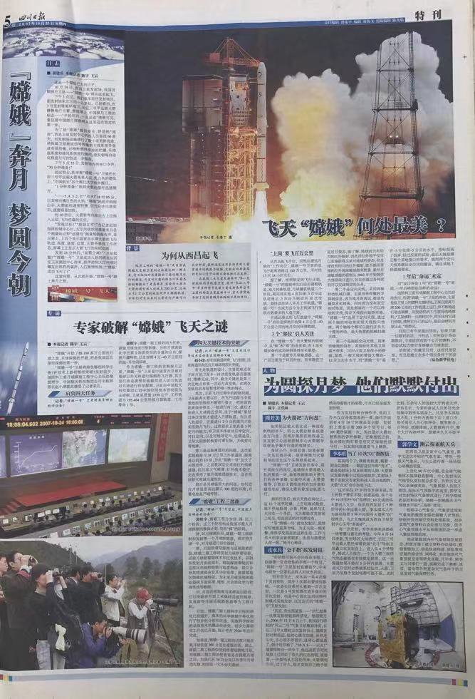 这是继人造地球卫星、载人航天之后,中国航天事业的第三个里程碑事件。四川日报记者王云当时在现场,他完整地见证了这个历史性时刻,并与同事们一起写下《“嫦娥”奔月 梦圆今朝》等稿件,刊发在2007年10月25日的川报上。“火箭冲入云霄的画面,现场人们激动跳跃的画面,我至今仍记得清清楚楚。”王云说。