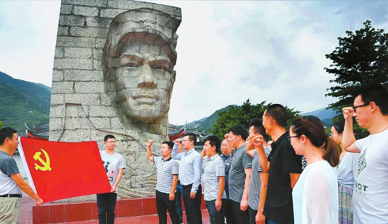 位于石棉县的安顺场中国工农红军强渡大渡河纪念碑前,党员干部在党旗前宣誓,开展“不忘初心、牢记使命”主题教育。 衡昌辉 摄(资料图片)