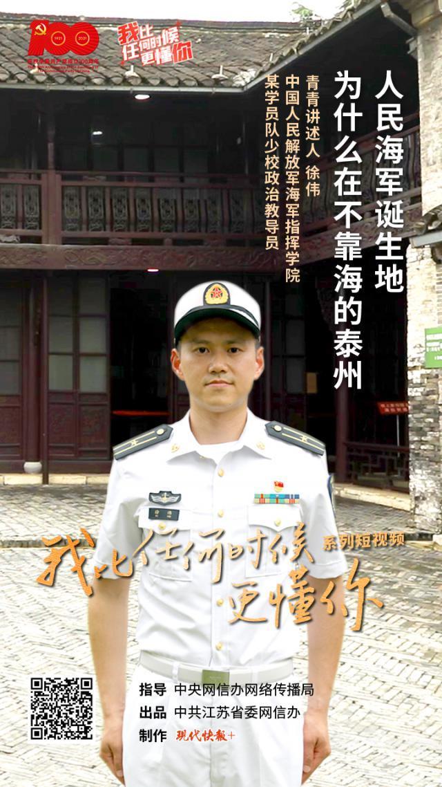 8 月 2 日,"我比任何时候更懂你"系列短视频第 9 集《人民海军诞生地为什么在不靠海的泰州?》上线,本集青青讲述人徐伟,是中国人民解放军海军指挥学院某学员队少校政治教导员。