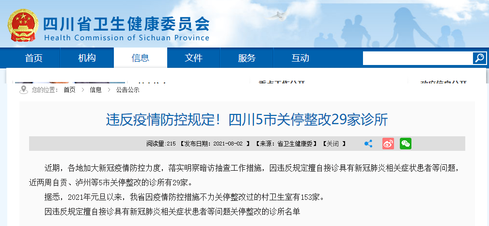 四川在线资阳频道消息(记者 王瑞琪)8月3日,记者从四川省卫生健康委员会官网了解到,因违反规定擅自接诊具有新冠肺炎相关症状患者等问题,资阳市共有3家诊所被关停整改。