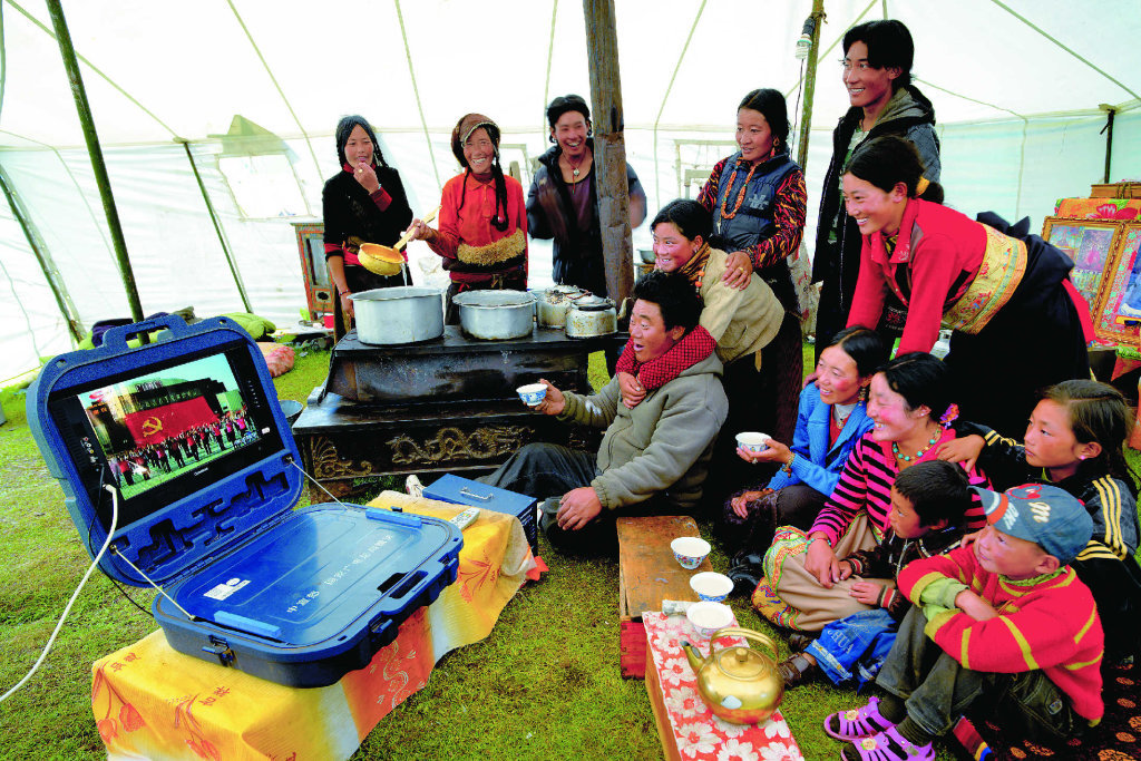 2011年7月,牧民群众在帐篷里收看移动电视。谭曦 摄(资料图片)