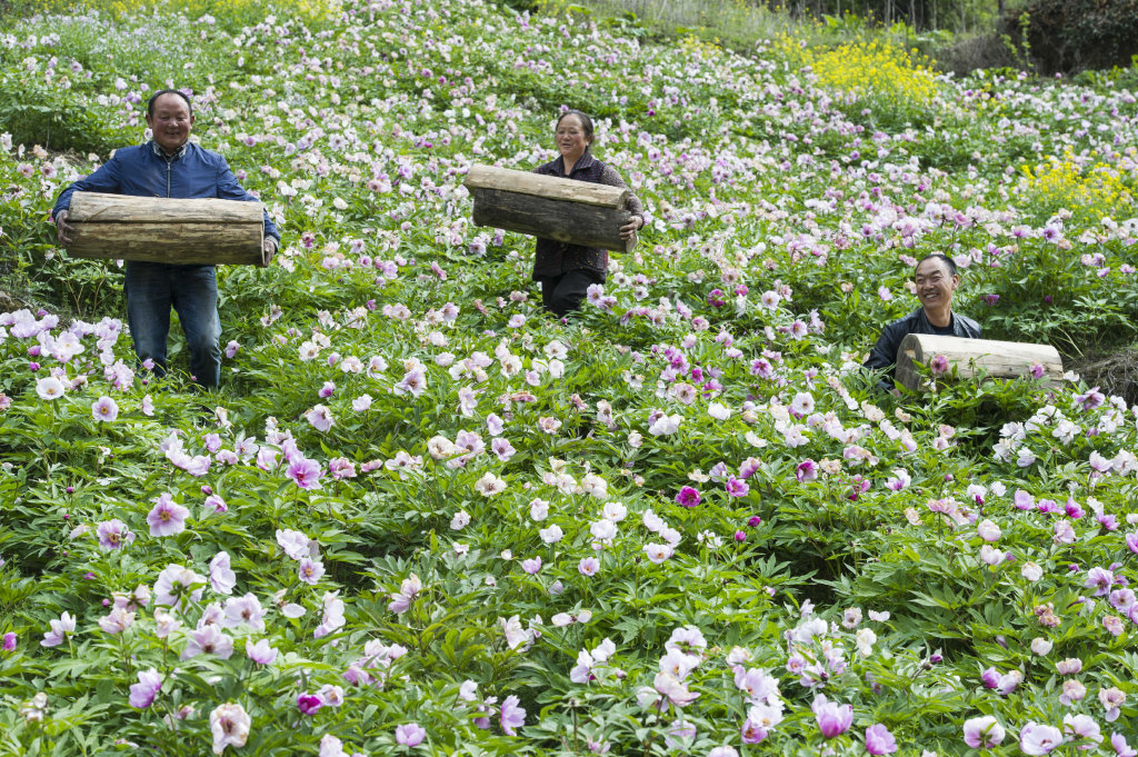 平武县黄羊关群众在芍药花地中安置蜂箱。何海洋 摄(资料图片)