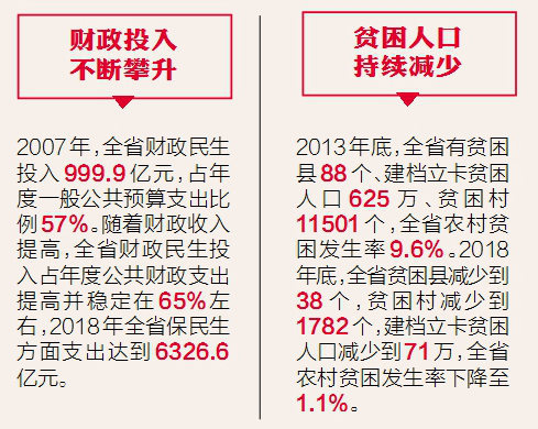 看投入。2007年,全省财政民生投入999.9亿元,占年度一般公共预算支出比例57%。随着财政收入提高,全省财政民生投入占年度公共财政支出提高并稳定在65%左右,2018年全省保民生方面支出达到6326.6亿元。