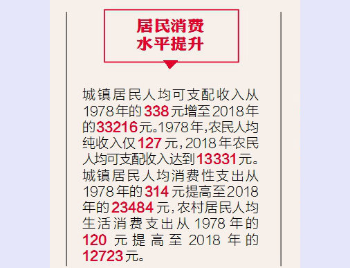收入水平不断攀升:城镇居民人均可支配收入从1978年的338元增至2018年的33216元;1978年,农民人均纯收入仅127元,2018年农民人均可支配收入达到13331元。其中,农村居民人均可支配收入连续多年高于全国增幅。