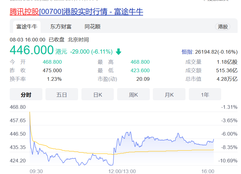 就龙头腾讯控股来看,其股价在早盘急挫,一度超跌10.61%。尽管在文章删除后,腾讯控股股价跌幅有所收窄,但依然下跌6.11%,报收446港元,市值较前一交易日蒸发近3000亿港元。