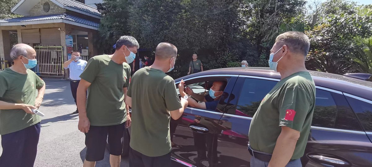 金马街道关工委组织“五老”志愿者助力疫情防控,在小区门口担任值守任务,对未戴口罩的居民进行劝导。
