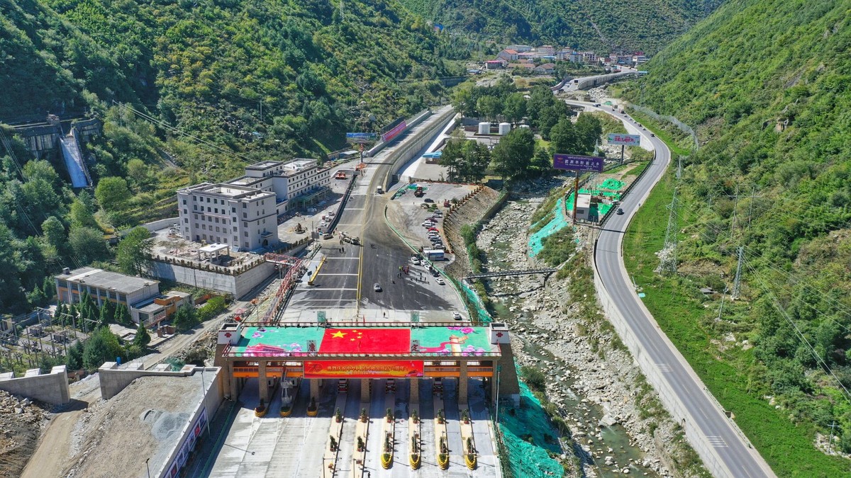 康定收费广场新建的康定站是雅康高速全线最大收费站,进口处共10个车道,已全面完成ETC系统安装,每小时能满足1400辆车辆进出。康定站设计融合了藏、汉元素,收费站两侧通过设在上方的廊桥连接,寓意藏汉连心桥。记者看到,喜迎新中国成立70周年,收费站顶部布设了一面巨大的五星红旗。