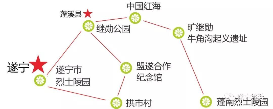 遂宁市烈士陵园—继勋公园—红海红军街—大石牛角沟旷继勋起义遗址—蓬南烈士陵园----------------------