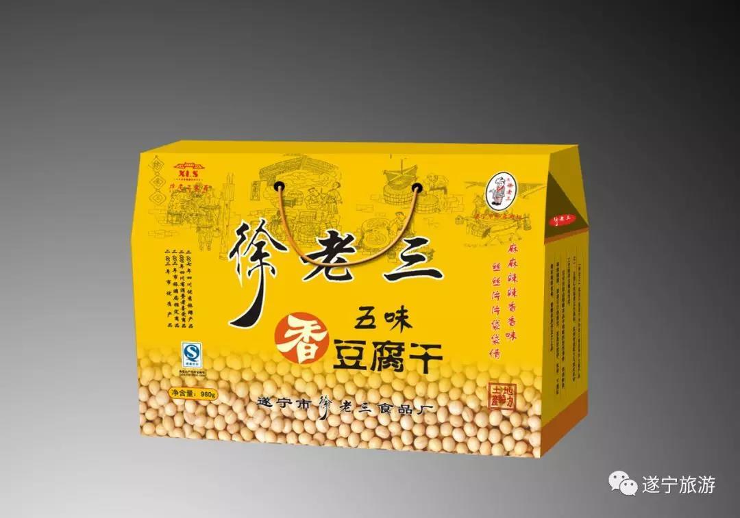 商品说明:“徐老三”软豆干主要以优等黄豆为原料,采用传统配方与现代科学工艺相结合精制而成。产品悠悠清香、绵绵鲜美、麻麻辣辣、津津可口,是您旅游、休闲、下酒佐料的美味佳肴,馈赠亲朋好友之上品,荣获“四川优秀旅游商品” “遂宁市非物质文化遗产”等荣誉称号。