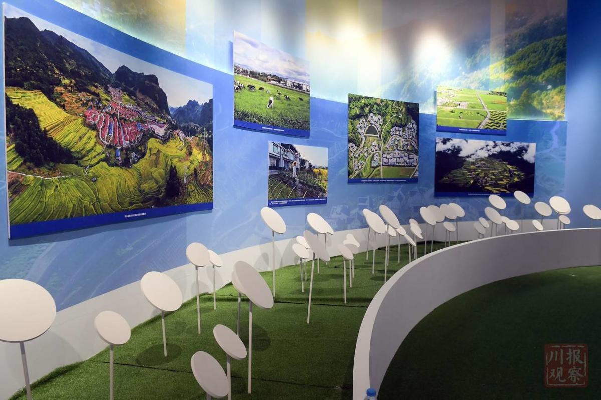 恢复高考后四川大学第一批新生入学的老照片;全省三级医院数居全国第三、二级医院数居全国第一的数据展示;三河村、火普村帮扶前后巨大变化的对比照片;大熊猫在竹林间休憩玩耍的大型情景展示;2015年和2018年成都人南立交空气质量改善对比图……