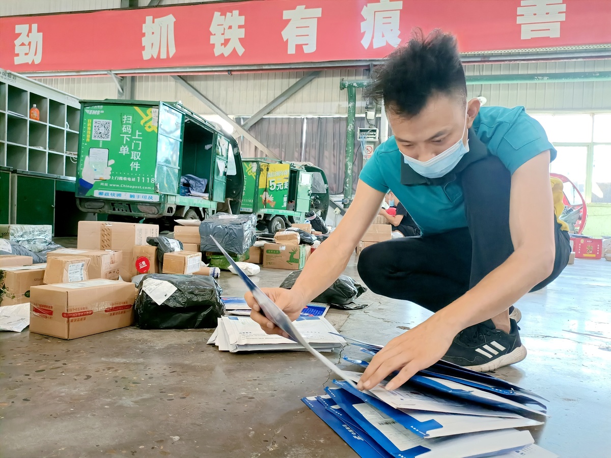 分拣、下段、扫描……有条不紊、认真做事的王金泉,身材略显瘦弱,在这群揽投员中比较显眼。头顶的工业吊扇孜孜不倦地转动着,为忙碌的人们送来些许清凉,但王金泉额头上的汗珠依然直往外冒。