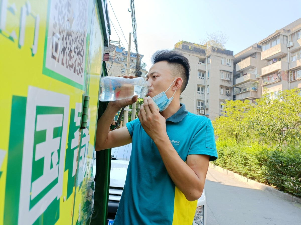 炎热夏天,水是高温下投递员必不可少的配置。为保障日常喝水,王金泉特意准备了一个2升的瓶子,工作间隙,他每天至少要喝3瓶。