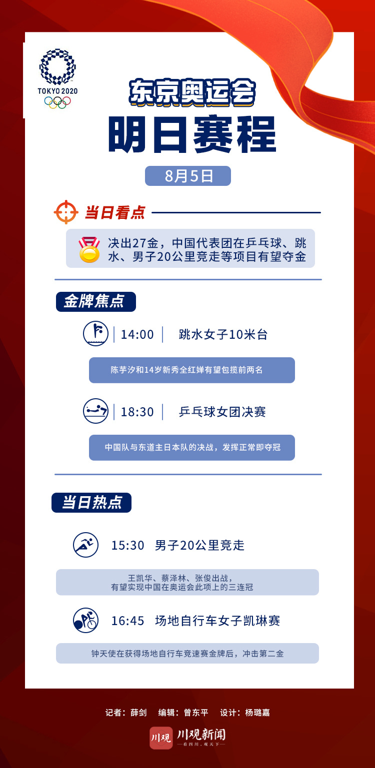 怀着这种愉快的心情,记者今晚继续预测8月5日中国军团的表现,预计中华健儿仍将揽金不停。朋友们也可以点击标题参与川观新闻的竞猜活动,为祖国加油:《加入25万人次参与的奥运竞猜 为中国健儿加油赢大奖》
