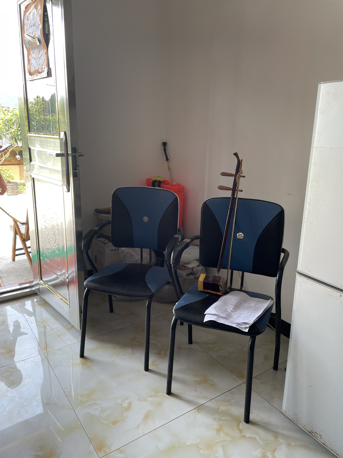 现在,龚映智差不多恢复了,院子边的花盆虽然参差不齐,但绿油油的植物都迎着阳光生长。独居的家中整洁,椅子上放着一把二胡,空闲时间他就演奏年轻时喜爱的旋律。