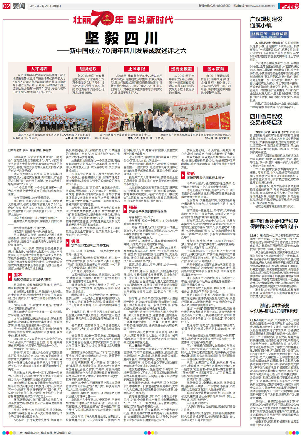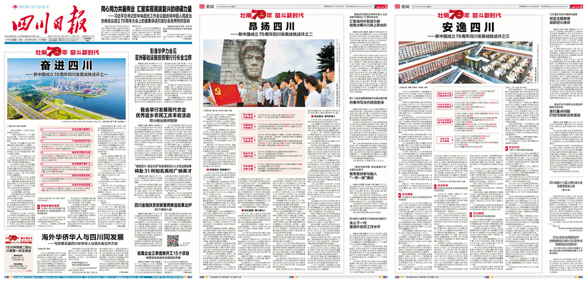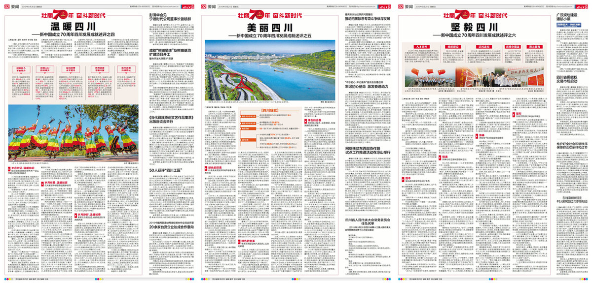 9月23日至9月29日,四川日报一共推出6篇重磅报道——“新中国成立70周年四川发展成就述评”,从经济社会发展的六大维度,展现四川70年来的伟大成就和经验智慧。
