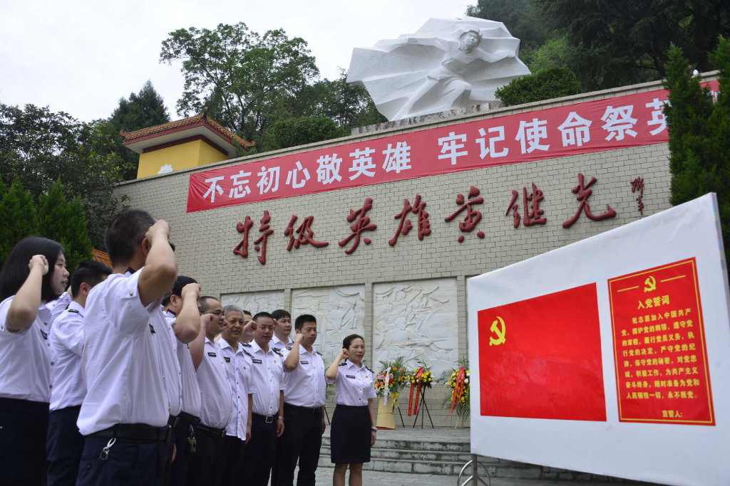 德阳市文广新局文化执法支队党支部来到黄继光纪念馆,在党旗下重温入党誓词。 寇元林 摄(视觉四川)
