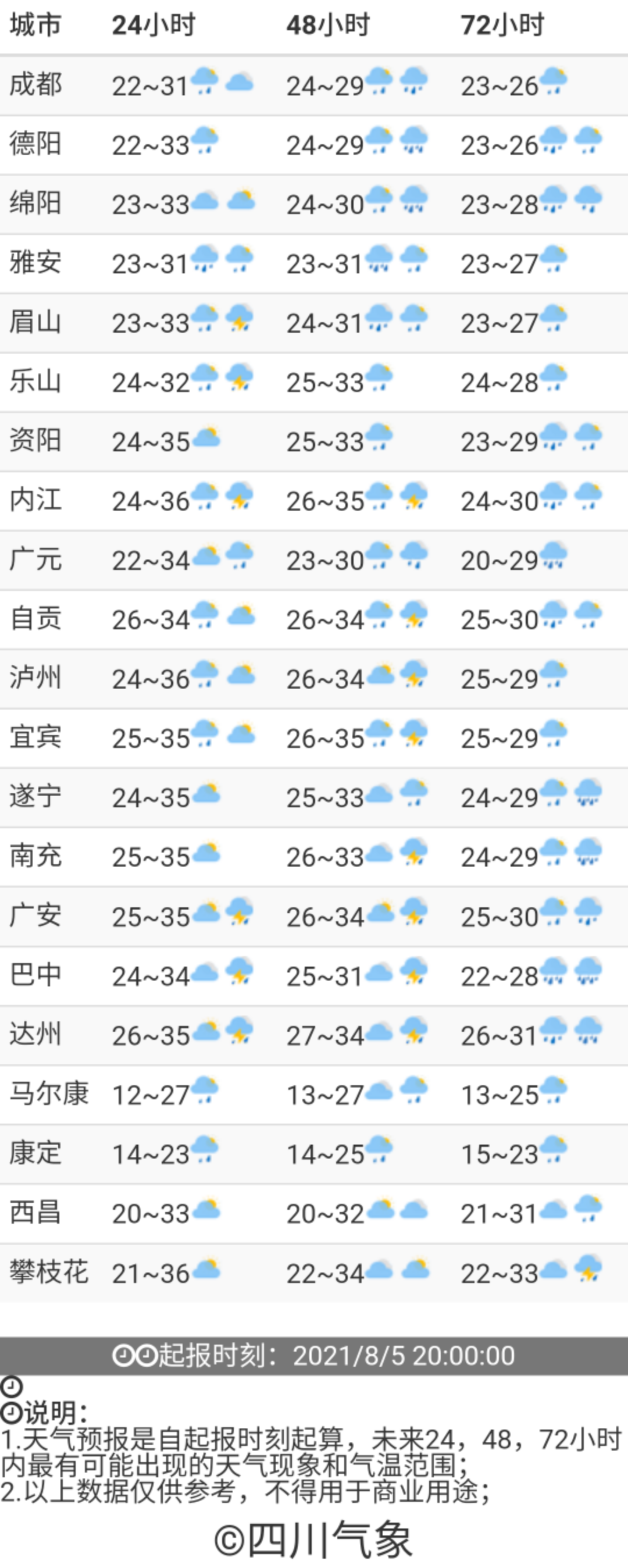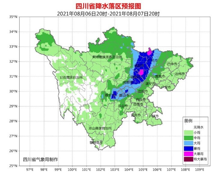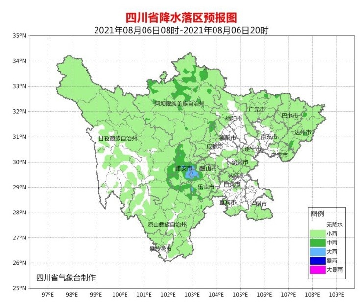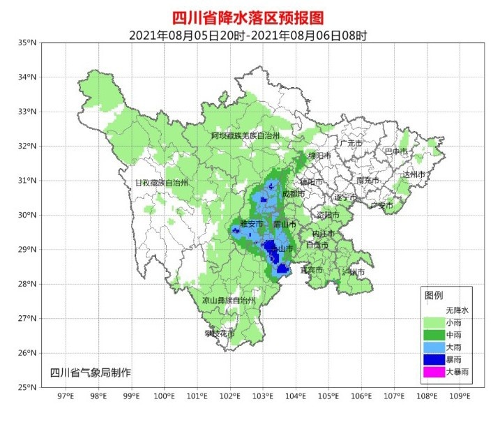 8月5日晚上到6日白天,盆地大部阴天间多云有阵雨或雷雨,雷雨时有短时阵性大风,其中雅安、眉山、乐山3市及绵阳、德阳、成都3市西部有中到大雨,局部暴雨;川西高原阴天间多云有阵雨或雷雨,其中甘孜州西北部、阿坝州北部有中雨;攀西地区多云间阴天有分散阵雨或雷雨,东北部有中到大雨,个别暴雨。