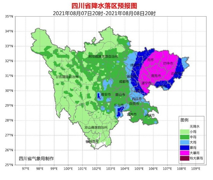 7日晚上到8日白天,盆地各市阴天有阵雨或雷雨,雷雨时有短时阵性大风,雨量普遍中雨,其中广元、巴中、南充、达州、广安、遂宁、资阳7市及绵阳、德阳、成都3市东部有暴雨或大暴雨;川西高原和攀西地区阴天间多云有阵雨或雷雨,局部有中到大雨。