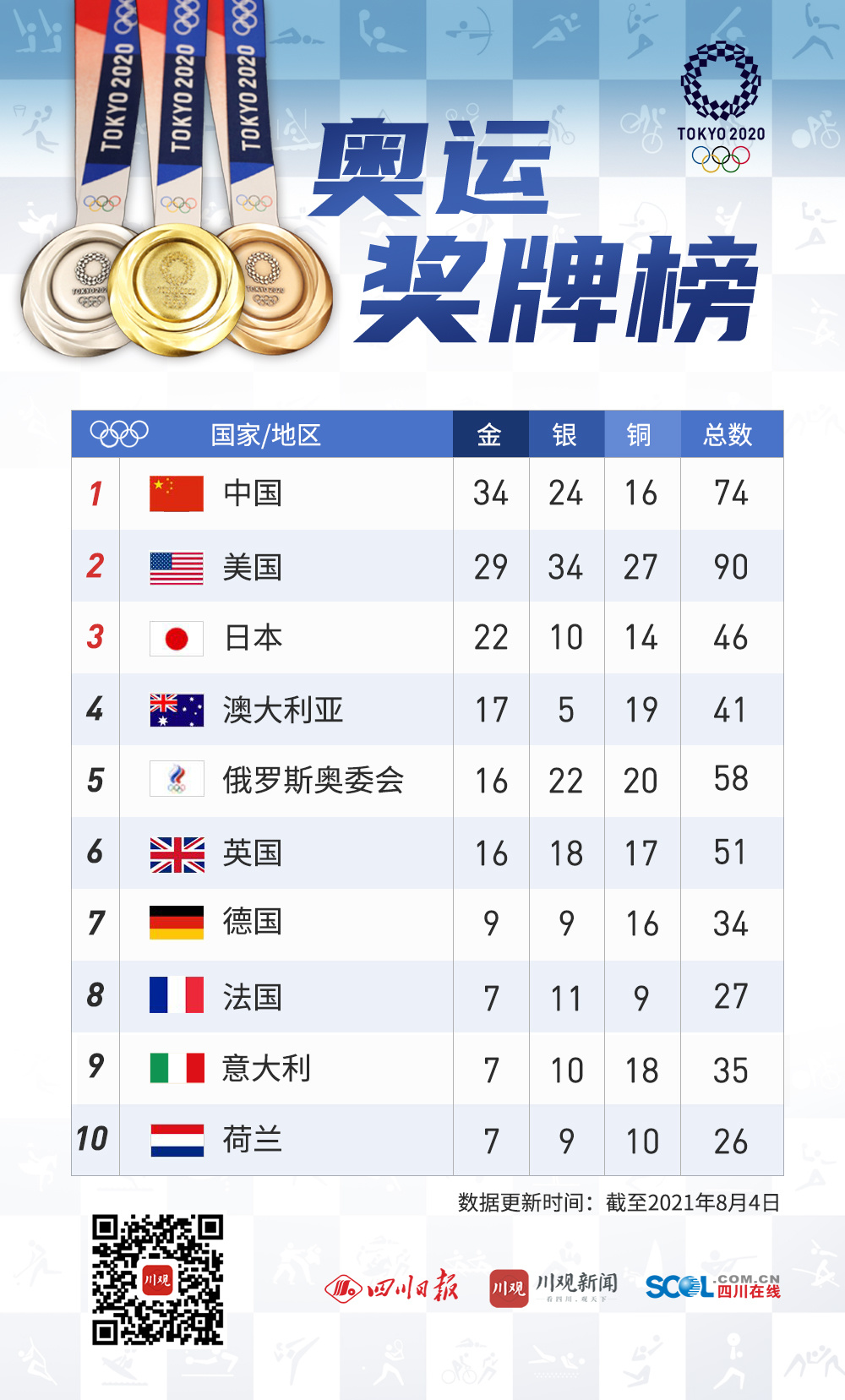 8月5日,2020年东京奥运会的第13个比赛日,中国代表团入账2金2银,在奖牌榜上稳居榜首。