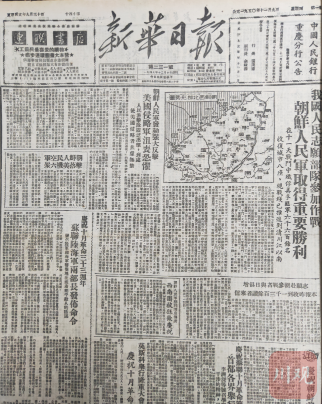 1950年11月9日,《新华日报》关于志愿军参加作战的报道。四川省档案馆提供