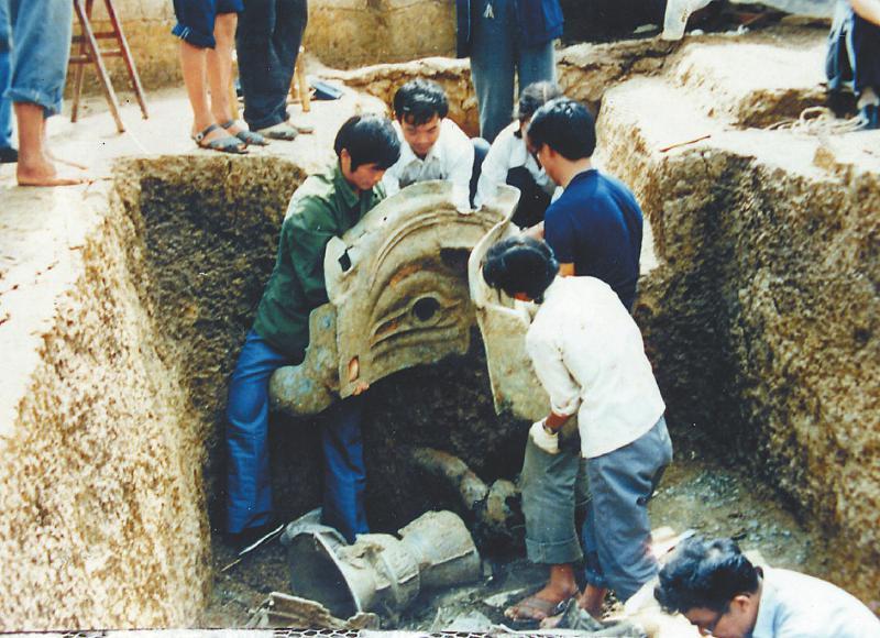 1986年三星堆祭祀坑发掘现场,考古人员正在把青铜面具抬出祭祀坑。四川省文物局供图