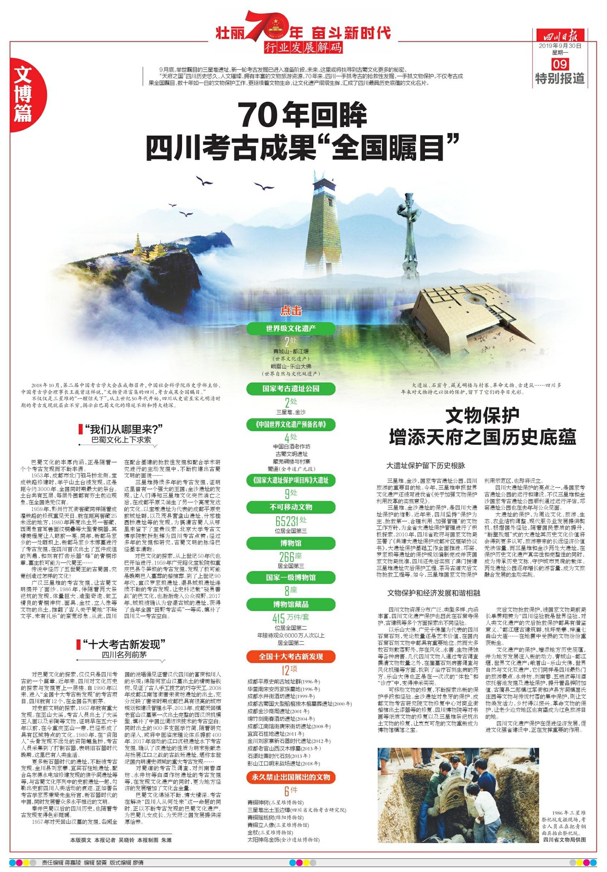 9月底,举世瞩目的三星堆遗址,新一轮考古发掘已进入准备阶段。未来,这里或将找寻到古蜀文化更多的秘密。“天府之国”四川历史悠久,人文璀璨,拥有丰富的文物旅游资源。70年来,四川一手抓考古的抢救性发掘,一手抓文物保护。不仅考古成果全国瞩目,数十年如一日的文物保护工作,更延续着文物生命,让文化遗产熠熠生辉,汇成了四川最具历史底蕴的文化名片。