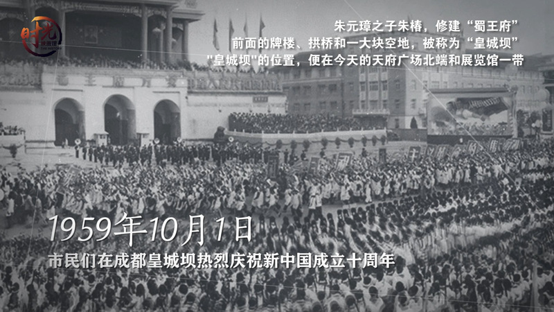 朱元璋之子朱椿,修建“蜀王府”,前面的牌楼、拱桥和一大块空地,被称为“皇城坝”。"皇城坝"的位置,便在今天的天府广场北端和展览馆一带。新中国成立后,随着人民南路、大型公共建筑和广场的修建,老皇城坝更名为人民南路广场。改革开放后,广场重新规划,设立了四川省展览馆。1999年,广场正式定名天府广场。每个城市都有这样一条路,它历史悠久、商业繁华:北京的王府井,上海的南京路,在成都,它叫“春熙路”。