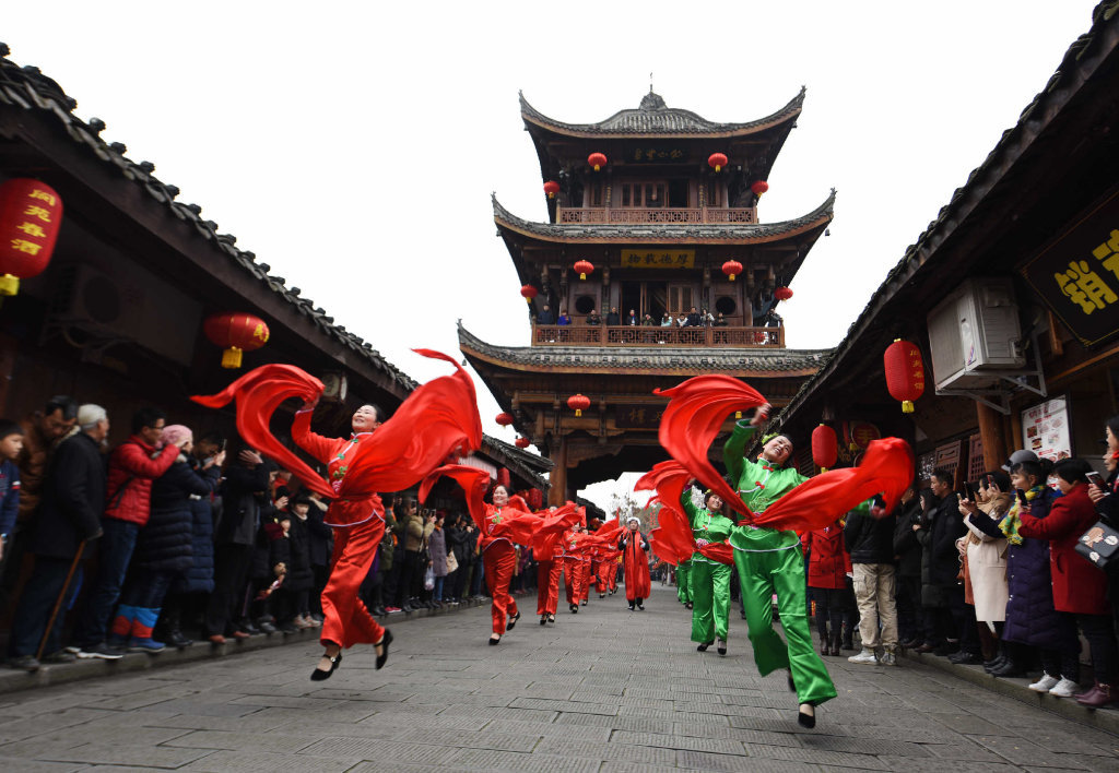 2018年2月11日,民间艺人在四川阆中古城扭秧歌。 当日,四川省阆中古城上演踩高跷、板凳龙、舞草龙等独具地方特色的年俗表演,古城处处洋溢着浓浓的年味,吸引众多游客前来观赏。 王玉贵 摄