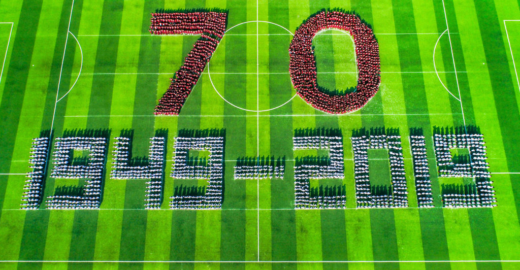 9月26日,遂宁市东辰荣兴国际学校千名学生拼贴出70字样,祝福新中国成立70周年 。 刘昌松 摄