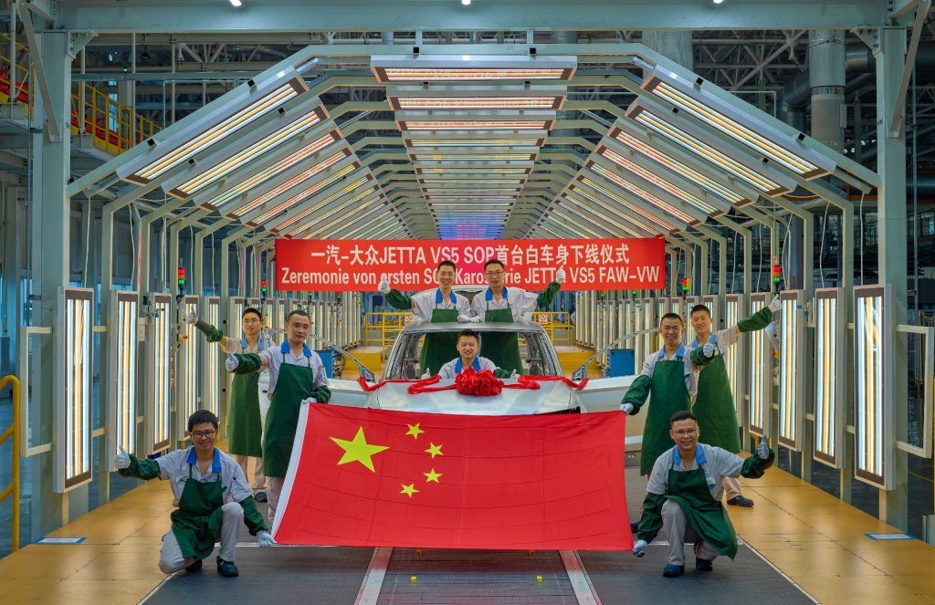 2019年国庆前夕,一汽-大众成都分公司职工在自主创新产品的下线现场,自豪为新中国点赞。